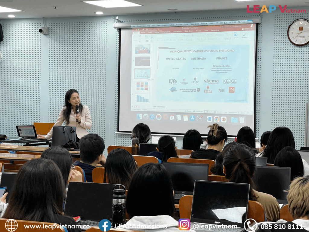 The session took place in a warm and interactive atmosphere, with many students raising questions about study abroad pathways, selecting the right academic programs, preparing applications, managing finances, and acquiring the skills needed to adapt to the academic and cultural environment in France. The LEAP Vietnam representative also introduced key partner universities, high-demand study fields, and the advantages of pursuing higher education in English at one of Europe’s leading education destinations.
